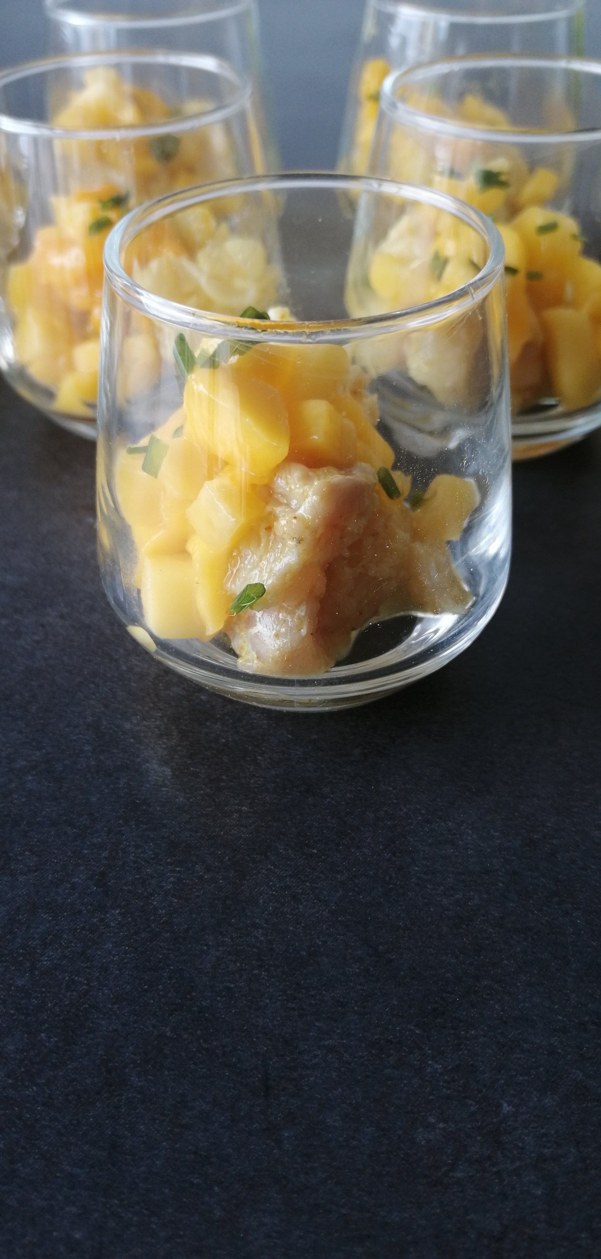 - Brochettes apéritives Brochettes de crevettes panées dés d'ananas sauce curry mangue les 20 pièces 26 euros